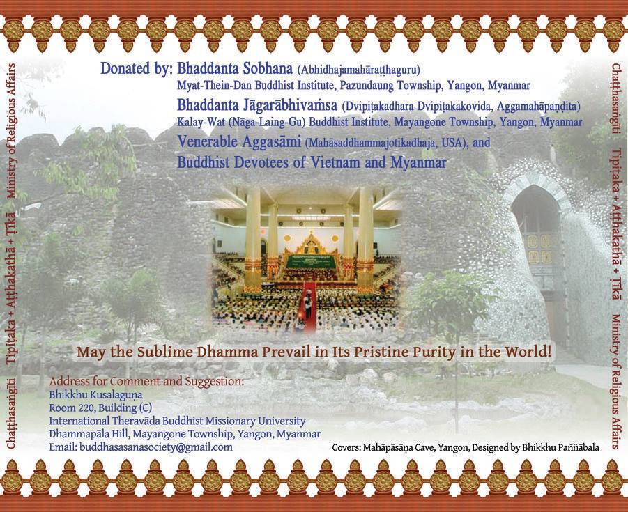 Namo Sammāsambuddhassa. Để có thêm tài liệu nghiên cứu Phật Giáo Nguyên Thuỷ và văn học Pāḷi bằng mẫu tự Latin, chúng tôi hân hạnh chia sẻ toàn bộ Chánh Tạng (Pāḷi, 40 quyển), Chú Giải (Aṭṭhakathā, 52 quyển) và Phụ Chú Giải (Ṭīkā, 26 quyển) do Hội Nghị Kết Tập Tam Tạng lần thứ 6 (1954-1956) hiệu đính, được thiết kế theo định dạng WEB và PDF trong tập tin sau đây. Đây là công trình chuyển mẫu tự toàn bộ Tam Tạng, Chú Giải và Phụ Chú Giải bằng mẫu tự tiếng Miến sang mẫu tự Latin do Ngài Thiền sư U Sīlānandābhivaṃsa khởi xướng vào năm 1992 và được hoàn tất cơ bản vào năm 2008. Toàn bộ nội dung và hình thức của ấn bản bằng mẫu tự Miến được bảo lưu trọn vẹn (ngoại trừ header được đơn giản hoá) trong ấn bản mẫu tự Latin này. Thật ra, công trình chuyển mẫu tự này được bắt đầu thực hiện trước công trình chuyển mẫu tự của Vipassana Research Institude, India, do thiền sư Goenka thành lập, nhưng do thiếu nhân lực và những nguyên nhân khách quan khác, cho nên đến năm 2008 mới có ấn bản CD-ROM đầu tiên. Nhận thấy đây là công trình quan trọng trong việc học tập và nghiên cứu Phật Giáo Nguyên Thuỷ bằng thánh ngữ Pāḷi với mẫu tự Latin, nhất là yếu tố bảo lưu toàn bộ nội dung và hình thức của ấn bản Tam Tạng, Chú Giải và Phụ Chú Giải của Hội Nghị Kết Tập Tam Tạng lần thứ 6 ở đất nước Phật Giáo Myanmar, chúng tôi đã phát tâm cộng tác với ban điều hành và ban hiệu đính trong suốt nhiều năm. Đặc biệt, công trình chuyển mẫu tự này đóng vai trò làm nền tảng rất quan trọng đối với các công trình biên soạn và dịch thuật các bộ từ điển Pāḷi-Việt từ nguồn tài liệu Pāḷi-Miến, nhất là bộ từ điển Tam Tạng Pāḷi-Miến mà chúng tôi đang thực hiện. Toàn bộ số trang tham khảo trong bộ từ điển Tam Tạng Pāḷi-Miến áp dụng theo số trang của ấn bản Tam Tạng, Chú Giải và Phụ Chú Giải của Hội Nghị Kết Tập Tam Tạng lần thứ 6, và ấn bản chuyển mẫu tự Latin này được dàn trang hoàn toàn giống với ấn bản của Hội Nghị Kết Tập Tam Tạng lần thứ 6 và theo định dạng PDF nên rất dễ dàng tra cứu và in ấn. Quý vị có