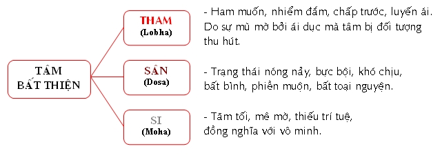 BẤT THIỆN 1. Ðịnh nghĩa: Tâm bất thiện là tâm ác, xấu, không tốt đẹp. Nói theo chi pháp, tâm bất thiện là những tâm sanh lên có sở hữu bất thiện đồng sanh và hòa hợp (theo lời giải của bộ Aṭṭhakathā). Phạn ngữ Akusalā dịch là bất thiện, phi thiện, có nghĩa là trái với thiện. Nếu thiện là những gì lành mạnh của tinh thần thì bất thiện là trạng thái suy nhược, bệnh hoạn của tâm (Rogayattha); nếu thiện là cái gì tốt đẹp thì bất thiện là cái gì không tốt đẹp; nếu thiện là cái gì khôn khéo thì bất thiện là cái gì vụng về; nếu thiện là cái gì hiền thiện thì bất thiện là cái gì tội lỗi; nếu thiện là cái gì tạo quả an lạc thì bất thiện là nguyên nhân sanh khổ đau. 2. Phân loại: