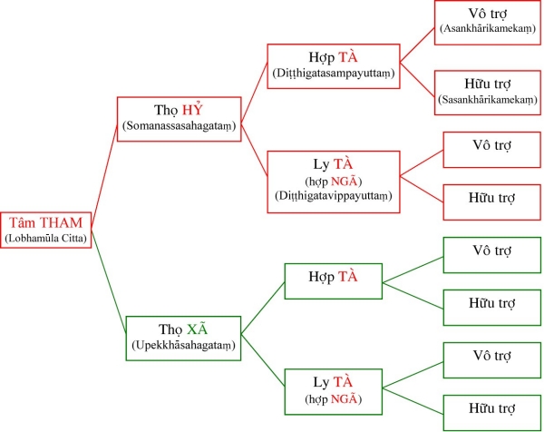 1.1) Tâm Tham (Lobhamūla citta): Tâm là biết cảnh, Tham là ham muốn. Tâm tham là trạng thái tâm biết cảnh với tư cách ham muốn, bị thu hút bởi đối tượng khả ái. Bộ Atthakathā giải rằng: Cittaṃ lubhatiti lobha cittaṃ = Tâm ái nhiểm gọi là tâm tham. Như vậy ta có thể nói tâm tham là sự bị cảnh thu hút, dính mắc đối tượng, và đối tượng của tâm tham là cảnh khả ái, cũng như đặc tánh của nam châm là hút sắt, thép, ... và những gì bị nam châm hút thì là chất kim loại. Tâm tham được chia làm 8 thứ, căn cứ vào 3 phương diện: - Thọ: Thọ hỷ hay thọ xã Thọ hỷ (Somanassavedanā): là cảm giác vui mừng, hoan hỷ của tâm. Thọ xã (Upekkhavedanā): là cảm giác thản nhiên, tự nhiên, vô tư của tâm. Hợp tà (Micchādiṭṭhigatasampayuttaṃ): là lòng ham muốn có sự hiểu sai, chấp lầm sự vật (tà kiến là không thấy rõ sự thật, không thấy lý vô thường, khổ não, vô ngã). Ly tà (Amicchādiṭṭhigatasaṃpayuttaṃ): không có sở hữu tà kiến đồng sanh, hòa hợp. Hữu trợ (Sasankhārikamekaṃ): là tâm sanh lên do sự trợ giúp nhiều lần, cần có động cơ thúc đẩy. Sự trợ giúp ở đây có thể là của chính mình (phân vân, suy nghĩ, đắn đo, ...) hay của người khác (dụ dổ, khuyến khích, kêu gọi, ...). Vô trợ (Asankhārikamekaṃ): là tâm sanh lên mau lẹ không cần có sự trợ giúp. Tám tâm Tham được cấu tạo như sau: 1) Tâm Tham Thọ Hỷ Hợp Tà Vô Trợ: là lòng tham với một cảm giác vui mừng, thích thú, có sự chấp sai và khởi lên một cách mau lẹ không do dự. 2) Tâm Tham Thọ Hỷ Hợp Tà Hữu Trợ: là lòng tham với một cảm giác vui mừng, có sự chấp sai, phát sanh chậm chạp (do suy nghĩ nhiều lần hay người khác phải xúi biểu nhiều lần). 3) Tâm Tham Thọ Hỷ Ly Tà Vô Trợ: là sự ham muốn với cảm giác thích thú, không hiểu sai, sanh khởi mau lẹ. 4) Tâm Tham Thọ Hỷ Ly Tà Hữu Trợ: là sự ham muốn với cảm giác vui mừng, không có sự hiểu sai, sanh khởi một cách chậm chạp. 5) Tâm Tham Thọ Xã Hợp Tà Vô Trợ: là sự tham muốn một cách thản nhiên, với sự nhận thức sai lầm, sanh khởi một cách mau lẹ. 6) Tâm Tham Thọ Xã Hợp Tà Hữu Trợ: là sự tham muốn một cách bình thản, với sự nhận thức sai lầm, sanh khởi chậm chạp. 7) Tâm Tham Thọ Xã Ly Tà Vô Trợ: là sự tham muốn bình thường, không có sự chấp lầm, khởi lên mau lẹ. 8) Tâm Tham Thọ Xã Ly Tà Hữu Trợ: là lòng tham muốn bình thản, không có sự hiểu sai, sanh khởi do sự thúc đẩy nhiều lần.