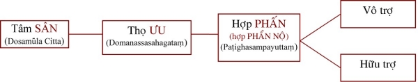 Nhân sinh Tâm Tham là Tục sinh có nghiệp Tham liên hệ, nối đời trước đã tham, gặp hoàn cảnh tốt và hay gặp cảnh vừa ý. Tâm Tham thường được phát khởi do nhiều nguyên nhân, nhưng nguyên nhân chính là sự tham ái (ái dục). 1.2) Tâm sân (Dosamūla Citta): Sân là sự khó chịu, trái ý, nghịch lòng, bất toại nguyện. Tâm sân là sự biết cảnh với tư cách nóng nảy, bất bình, không vừa ý. Ðặc tính của tâm sân là hủy diệt đối tượng, không chấp nhận đối tượng (trái với tâm tham là gìn giữ, ôm ấp đối tượng). Cảnh của tâm sân là những đối tượng khả ố, cũng như lửa có đặc tánh thiêu đốt. (1) Tâm Sân Thọ Ưu Hợp Phấn Hữu Trợ: là sự nóng giận, ưu phiền, sanh lên do sự thúc đẩy nhiều lần. Thí dụ: một người tánh hay vui vẽ, gặp một người dùng lời chửi mắng, lúc đầu tâm chưa phản ứng gì, sau khi nghe nhiều lần thì nổi giận. Sự nổi giận ấy là tâm hữu trợ vậy. (2) Tâm Sân thọ Ưu Hợp Phấn Vô Trợ: là sự khó chịu, trái ý, nghịch lòng phát sinh lên mau lẹ không cần một động năng nào thúc đẩy cả. Thí dụ: một người quen tật sân, ai chạm một chút cũng nổi giận, do đó, khi vừa gặp cảnh bất như ý là tâm sân liền nổi lên. Tâm sân đó là tâm sân vô trợ vậy.