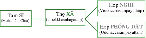 Tâm sân thường sanh khởi do nhiều nguyên nhân, như do tánh quen sân, là có thói quen gặp gì trái ý cũng phát sanh sân hận, hay đối với bản tánh nông nỗi, thiếu sự suy xét sâu xa cũng là yếu tố làm tâm sân phát khởi; hoặc đối với người thiếu sự học hỏi, tánh tình thô lỗ cũng là một nguyên nhân làm tâm sân dể phát khởi; và nguyên nhân chính phải nói là sự gặp cảnh không tốt, khả ố. 1.3) Tâm Si ( Mohamūla Citta): Si là sự si mê, mờ ám. Tâm si là trạng thái tâm mê tối, thiếu sự sáng suốt. Hành động mù quáng, sai lầm vì không thấu triệt các sự vật.(1) Tâm Si Hợp Hoài Nghi (Vicikicchāsampayuttaṃ): là sự mờ ám, si mê của tâm do sự lưởng lự, phân vân. Sự hoài nghi ở đây phải hiểu là sự hoài nghi có hậu quả tai hại như hoài nghi Tam Bảo, hoài nghi Tam Học, hoài nghi Tam thế, hoài nghi duyên sinh, ... Hoài nghi Phật: là không tin sự giác ngộ, hay không tin tuệ giác hoặc oai lực của Ðức Phật. Hoài nghi Pháp: là nghi ngờ về công năng của pháp bảo, hoài nghi về tánh cách chắc thật và hiệu quả của Phật pháp. Hoài nghi Tăng: là sự nghi ngờ về sự thành tựu giới hạnh, thành tựu đạo quả của chư tăng. Hoài nghi Tam học: là sự nghi ngờ về pháp tu tam học như hoài nghi về sự trong sạch của giới, hoài nghi sự thanh tịnh tiến hóa của định, hoài nghi sự sáng suốt, tỏ ngộ của tuệ. Hoài nghi Tam thế: là phân vân về tự ngã (Atta) trong quá khứ, hiện tại và vị lai. Hoài nghi về Duyên Sinh: là sự nghi ngờ về hiện tượng sanh tử, phân vân về đời sống hiện hữu của chúng sanh. Nên nhớ ngoài những hoài nghi kể trên còn có những hoài nghi thông thường, như do dự trước khi hành động, muốn đi đâu nhưng còn do dự vì sợ có khách đến thăm bất tử ... những hoài nghi đó không thuộc vào tâm Si hoài nghi. (2) Tâm Si Hợp Phóng Dật (Uddhacca Mohacittaṃ): là sự mù quáng, thiếu sáng suốt do sự lao chao, bấn loạn của tâm. Phóng = ném, dật = tung tóe; Phóng dật là sự ném một vật vào đống tro làm bay lên mù mịt, giống như một người đang ngồi làm việc, bổng có một tiếng động lớn làm người đó giựt mình hay như một người sợ ma, lúc đi đêm, bất chợt gặp bóng đen, người đó sợ hải la lên, tâm bị loạn động.