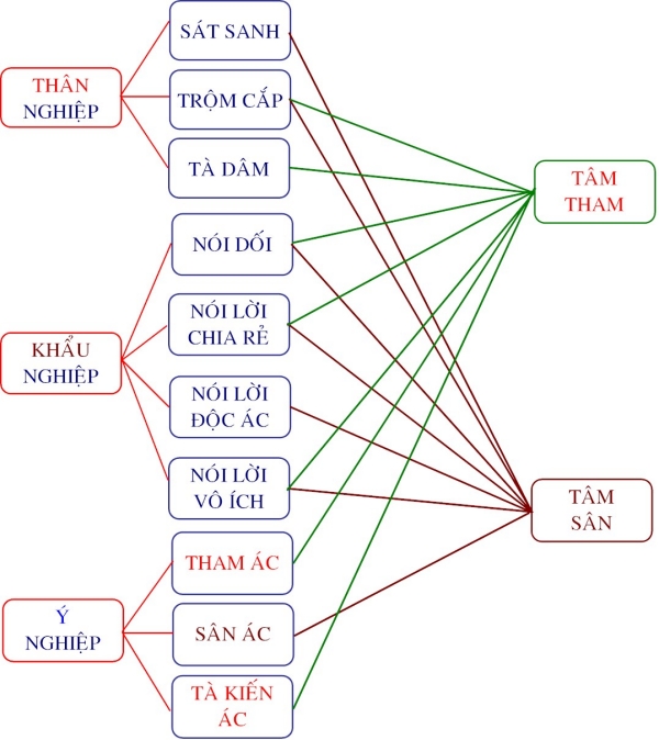 Sở dỉ ở đây không nói đến tâm Si vì hành sự của tâm này đã rõ ràng qua tên gọi của mỗi thứ tâm như ngờ vực là hành sự của tâm Hoài Nghi; bấn loạn là hành sự của tâm Phóng Dật. Còn đối với thập ác, tâm Si quá yếu ớt nên không thể can dự vào. 4. Tác năng tạo quả Trong 12 tâm bất thiện, khi tạo các ác nghiệp thì sẽ cho quả nặng nhẹ như sau Tâm Thọ Hỷ có quả nặng hơn tâm Thọ Xã. Vì nghiệp (Kamma) hay hành động tạo quả, phần chủ yếu là sự chủ tâm, cố ý (hay sở hữu Tư – Cetanā – Phật ngôn: "Cetanānaṃ Bhikkhavekammaṃ vadāmi = Nầy các Tỳ Khưu, Nghiệp là Sở hữu Tư"). Do đó, nếu sự cố ý mạnh sẽ cho quả nặng và ngược lại. Những tâm làm ác với sự thỏa thích (Thọ Hỷ), đương nhiên sẽ có sự cố ý mạnh hơn những tâm hành sự với cảm thọ bình thường (Thọ Xã); hay những tâm mang kiến chấp sai lầm (Hợp Tà), có sự chủ tâm mảnh liệt hơn những tâm không cố chấp (Ly Tà); những tâm phát khởi mau lẹ (Vô Trợ) sẽ có chủ ý, có tâm mạnh hơn những tâm sanh khởi nhờ sự trợ giúp nhiều lần (Hữu Trợ) vì cần có động cơ thúc đẩy, tâm hữu trợ thường sinh lên với tính cách gượng gạo nên sự chủ tâm trong tâm này rất yếu. 5. Nhân sanh tâm bất thiện 5.1) Tâm không khéo tác ý (Ayoniso mānasikāra): là sự không khéo dùng tâm hay vụng về trong cách suy nghĩ, thí dụ: trước sự bất hạnh, đau khổ xảy đến, một người khéo tác ý sẽ nghĩ rằng "Ðây là một cơ hội để ta hành pháp nhẫn nại", rồi người ấy hoan hỷ đón nhận nghịch cảnh đó. Trái lại, người không khéo tác ý sẽ than thở, phát tâm sầu muộn (tâm Sân dấy lên). Do đó, có thể nói không khéo tác ý là một nguyên nhân sanh tâm bất thiện.5.2) Ở xứ không nên ở (Appatirāpadanevada): là trú ngụ ở những nơi phát sanh nhiều phiền não, gây tai hại cho tinh thần, khiến tâm hằng giao động, như những nơi thường có chiến tranh, những nơi gần chốn ăn chơi, ... đều là những nơi không nên ở vì tục ngữ có câu "Ở bầu thì tròn, ở ống thì dài", ngoài lý do bản tánh và thói quen ở kiếp trước, con người còn dể bị ảnh hưởng bởi môi trường chung quanh mình. Vì vậy, có thể nói, cư ngụ ở những nơi không nên ở cũng là một nguyên nhân sanh tâm bất thiện. 5.3) Thân cận phi thiện nhơn (Asappurisapanissaya): Phi thiện nhơn là những người có thân ác, khẩu ác và ý ác; những người thiếu giới đức, kém trí tuệ. Khi giao thiệp với những người ấy, ta dể bị ảnh hưởng theo ("gần mực thì đen!"), do đó việc thân cận phi thiện nhơn cũng là một nguyên nhân sanh tâm bất thiện. 5.4) Ðời trước không có thói quen tạo phước (Pubbe akata puññata): Có thể nói phiền não của chúng sanh giống như cỏ, thiện pháp của chúng sanh giống như lúa; lúa khó trồng mà dể chết, còn cỏ không trồng nhưng khó diệt. Nói một cách khác, tâm bất thiện là mộât bản năng thường có của chúng sanh ("nhân chi sơ, tính bổn ác!"). Vì vậy, một người không có thói quen tạo phước thì rất dể sinh ác tâm. 5.5) Hướng mình theo tà vạy (Attamicchapanidhi): tức là có khuynh hướng làm điều ác, nuôi hoài bảo bất chánh, có lập trường bất hảo. Như một người muốn làm du côn; muốn trở thành tướng cướp ... Do thực hành theo những ý hướng bất chánh đó, người ấy tạo ra những hành động bất thiện. -ooOoo-