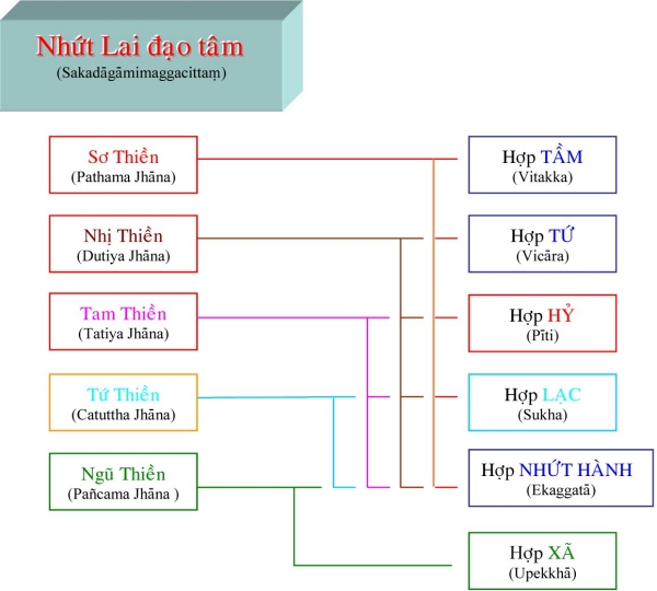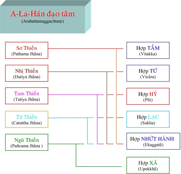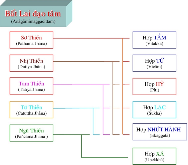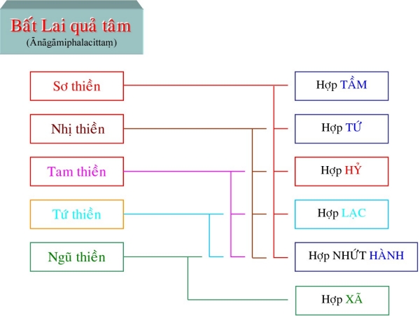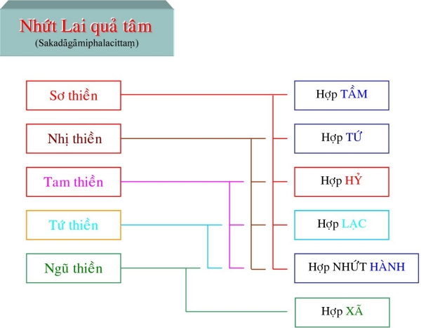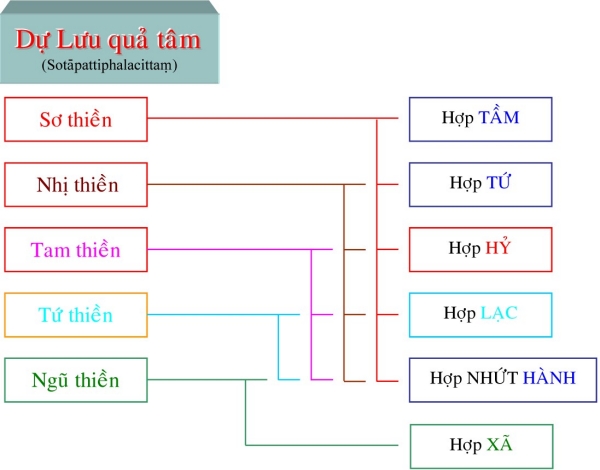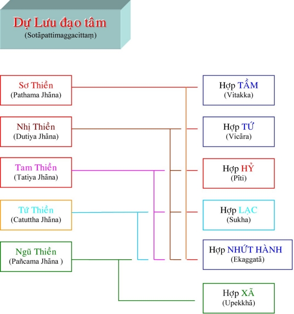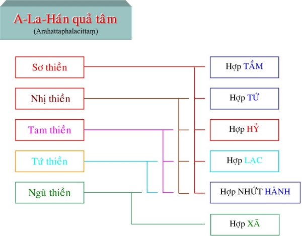 II. Tâm Quả Siêu Thế Là tâm thành tựu do tâm Ðạo Siêu Thế. Những tâm này được sanh lên ngay khi tâm đạo vừa diệt, liên tục không gián đoạn dù chỉ một tâm sát na. Những tâm quả này có trạng thái giống như tâm đạo, bắt một cảnh với tâm đạo, chỉ khác là những tâm này không sát trừ phiền não như tâm đạo (khi những tâm này sinh lên, thì phiền não đã bị các tâm đạo diệt tận). Tương ưng với tâm đạo, tâm quả Siêu thế cũng được chia làm 4 tâm: 1) Tâm Sơ Quả (Sotāpattiphalacittaṃ) Tâm Sơ Quả được chia ra làm ba loại: Ekabija: Nhất hườn sanh nhơn, là vị sơ quả này làm người một kiếp rồi đắc quả A-La-Hán hoặc các quả vị khác. Kolamhola: Ða lục hườn nhơn, là vị sơ quả tục sinh làm người từ hai đến sáu kiếp, sẽ đắc quả A-La-Hán hoặc các quả vị khác. Sattakkhataṃ: Ða thất hườn nhơn, vị này chậm trể lắm thì đến kiếp thứ bảy sẽ đắc quả A-La-Hán hoặc các quả vị khác. 2) Tâm Nhị Quả (Sokadāgāmiphalacittaṃ) Tâm Nhị Quả được chia làm năm bực: - Sau khi đắc Nhị quả, hành giả đắc luôn Tứ quả, chứng Niết-Bàn tại cõi Dục giới. - Chư Thiên đắc Nhị quả và đắc luôn Tứ quả, chứng Niết-Bàn tại cõi Chư Thiên. - Hành giả đắc Nhị quả trong cõi Dục giới, được sanh lên cõi trời và chứng đắc Tứ quả, nhập Niết-Bàn ngay trong cõi ấy. - Chư Thiên đã chứng đắc Nhị quả trên cõi trời, sanh xuống cõi Dục giới, chứng đắc Tứ quả, đạt Niết-Bàn trong cõi Dục giới. - Hành giả đắc Nhị quả sanh về cõi Chư Thiên, hết tuổi thọ, sanh trở lại ở cõi Dục giới, tu tiếp và chứng đắc Tứ quả, đạt ngộ Niết-Bàn trong cõi Dục giới. 3) Tâm Tam Quả (Ānagāmiphalacittaṃ) Tâm Tam quả được chia làm năm loại: - Trung ban bất hườn: hành giả sau khi chứng Tam quả trong cõi Dục giới được sanh về cõi Ngũ Tịnh Cư Thiên, tiếp tục tu hành và sẽ chứng quả A-La-Hán trong nửa tuổi thọ trở về trước. Cõi Ngũ Tịnh Cư Thiên gồm có năm cõi, hành giả trong lúc tu tập tùy theo căn phần phát triển sẽ thọ sinh vào một trong các cõi đó. Tín căn mạnh sẽ được sanh vào cõi Vô Phiền Thiên (Avihā) tuổi thọ là 1000 đại kiếp. Tấn căn mạnh sẽ được sanh về cõi Vô Nhiệt Thiên (Atappā) tuổi thọ là 2000 đại kiếp. Niệm căn mạnh sẽ được sanh về cõi Thiện Kiến Thiên (Sudassī) tuổi thọ là 4000 đại kiếp. Ðịnh căn mạnh sẽ được sanh về cõi Thiện Hiện Thiên (Sudassā) tuổi thọ là 8000 đại kiếp. Huệ căn mạnh sẽ được sanh về cõi Sắc Cứu Kính Thiên (Akaniṭṭhā) tuổi thọ là 16000 đại kiếp. - Sanh ban bất hườn: vị Tam quả này tương tợ như Trung ban bất hườn, nhưng chứng đạo quả A-La-Hán từ nữa tuổi thọ trở về sau. - Vô hành ban bất hườn: vị này đầy đũ căn lành, hành đạo đắc quả A-La-Hán dể dàng không cần tinh tấn lắm (Asañkhāraparinibbāyi). - Hữu hành ban bất hườn: vị này căn lành còn yếu nên phải tinh tấn lắm mới đắc A-La-Hán (Sasañkhāraparinibbāyi). - Thượng lưu ban bất hườn: vị này căn lành quá yếu, phải sanh vào cõi Ngũ Tịnh cư thấp nhứt, sống hết tuổi thọ rồi sanh lên cõi Ngũ tịnh cư cao hơn, cứ tu tập như thế cho đến khi sống hết 5 cõi Ngũ tịnh cư mới đắc quả A-La-Hán, chứng ngộ Niết-Bàn. 4) Tâm Tứ Quả (Arahattaphalacittaṃ) Tâm Tứ quả được chia làm ba loại: - Tứ quả Toàn Giác: là bậc hoàn toàn giác ngộ, có nhứt thiết chủng trí do tu đầy đủ 30 độ Pārāmi. Sau khi chứng quả Chánh Ðẳng Chánh Giác, vị này có khả năng xử dụng các chế định tục đế để diễn đạt các pháp chơn đế cho chúng sanh hiểu, cứu độ vô số chúng sanh. - Tứ quả Ðộc Giác: là bậc tự mình tu tập và hoàn toàn giác ngộ do thực hành 20 độ Ba la mật. Vị này không có khả năng diễn đạt chánh pháp để cứu độ chúng sanh. - Tứ quả Thinh Văn Giác: là bậc hoàn toàn giác ngộ nhờ nghe và tu tập theo sự hướng dẩn của bậc toàn giác. Thực hành 10 độ Ba la mật. Sau khi đắc đạo quả Niết-Bàn có khả năng độ chúng sinh đồng đắc đạo quả Niết-Bàn. Ghi nhớ rằng trong các tâm Hiệp thế thì Sở Hữu tâm làm chủ động, nhất là sở hữu Tư, tất cả các pháp đồng sanh để tạo nghiệp. Trong các tâm Siêu thế thì Sở Hữu Trí Tuệ làm chủ động mạnh hơn cả. Khi hành giả tu Tuệ quán nếu trình độ tâm định đã đạt đến loại thiền nào trong năm bực thiền chỉ thì đến khi thành tựu đạo quả, hành giả cũng có trình độ tâm như vậy. Thí dụ: hành giả đã đắc tam thiền, khi hành thiền quán, tỏ ngộ Niết-Bàn, đắc sơ đạo, thì tâm đạo ấy là Sơ đạo tam thiền, tâm này cũng có Tầm, Tứ. Ðối với hành giả chưa đắc bậc thiền nào, thì đạo quả sẽ được coi như tương đương với người đã đắc sơ thiền. Dù tâm Siêu thế được phân theo 5 bực thiền chỉ là do tính theo chi thiền, nhưng tâm đạo và tâm quả ở đây có đối tượng là Niết-Bàn chứ không phải là các đề mục tu tập của thiền chỉ. TÂM SIÊU THẾ