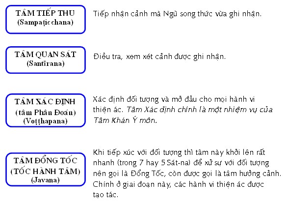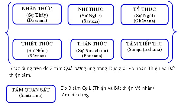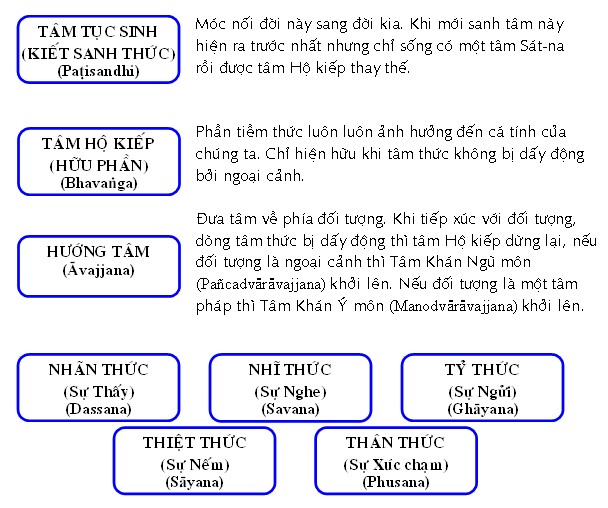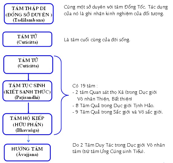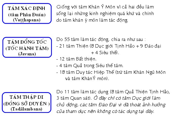 Tóm lại: - 2 tâm Quan sát thọ Xã làm 5 tác dụng: - Tâm tục sinh (Kiết sanh thức) - 8 tâm quả trong Dục giới Tịnh Hảo làm 4 tác dụng: - Tâm tục sinh (Kiết sanh thức) - 9 tâm Quả trong Sắc giới và Vô sắc giới làm 3 tác dụng: - Tâm tục sinh (Kiết sanh thức) - 1 tâm Quan sát thọ Hỷ làm 2 tác dụng: - Tâm Quan sát - Tâm Khán Ý môn có 2 tác dụng: - Tâm Xác định (tâm Phân Ðoán) - Tâm Khán Ngũ Môn làm nhiệm vụ hướng tâm (khai mở lộ ngũ môn). Tâm chia theo CĂN MÔN Nhãn môn: có 46 tâm:- 1 Tâm Khán ngũ môn. Nhĩ môn, tỷ môn, thiệt môn và thân môn: cũng có ở mỗi cửa là 46 tâm. Tổng cộng có tất cả là 54 tâm khởi qua ngũ môn. Ý môn: có tất cả 67 tâm khởi lên. Tâm Khán Ý môn. 55 tâm Ðổng tốc: 12 Tâm Bất thiện. 11 tâm Thập di: 8 Tâm Dục giới Tịnh Hảo (8 tâm Quả). Ngoài ra có 19 tâm không khởi qua căn môn nào vì chúng chỉ là quả của các hành động trong quá khứ. Các tâm đó là: 2 Tâm Quan sát thọ Xã. 19 tâm vừa kể trên chỉ làm tác dụng tâm Tục Sinh, tâm Hộ Kiếp và tâm Tử. Tóm lại: - 36 tâm khởi qua một cửa: 10 thức tâm (Ngũ song thức): 2 Tâm khởi qua nhãn môn. 10 Tâm Sắc giới ( tâm Thiện và tâm Duy tác). [Khởi qua ý môn] 8 Tâm Vô sắc giới (tâm Thiện và tâm Duy tác). [Khởi qua ý môn] 8 Tâm Siêu thế (tâm Ðạo và tâm Quả). [Khởi qua ý môn] - 3 tâm khởi qua 5 cửa: (không khởi qua ý môn) Tâm Khán ngũ môn. - 31 tâm khởi qua 6 cửa: Tâm Quan sát thọ Hỷ. - 10 tâm khởi qua 6 cửa và đồng thời cũng không khởi qua cửa nào: 2 Tâm Quan sát thọ Xã. 10 tâm trên khi làm công tác Thập di thì chúng khởi qua 6 cửa; nhưng khi chúng làm công tác Tục sinh, Hộ kiếp và tâm Tử thì chúng không khởi qua cửa nào hết. - 9 tâm hoàn toàn không khởi qua cửa nào hết: 5 tâm Quả trong Sắc giới. 9 tâm này là quả của tâm Thiền nên không khởi lên trong tâm thức của Dục giới. Chúng chỉ làm công tác Tục sinh, Hộ kiếp và tâm Tử. Phân loại theo ÐỐI TƯỢNG Tâm có 6 đối tượng là Sắc, Thinh, Khí, Vị, Xúc và Pháp. Pháp, đối tượng của ý căn cũng có 6 đối tượng là Tịnh sắc căn, Tế sắc căn, Tâm, Tâm sở, Niết bàn và Khái niệm. 1) Sắc là đối tượng duy nhất của nhãn thức, đối tượng ấy xảy ra trong hiện tại. 2) Thinh là đối tượng duy nhất của nhĩ thức, đối tượng ấy xảy ra trong hiện tại. 3) Khí là đối tượng duy nhất của tỷ thức, đối tượng ấy xảy ra trong hiện tại. 4) Vị là đối tượng duy nhất của thiệt thức, đối tượng ấy xảy ra trong hiện tại. 5) Xúc là đối tượng duy nhất của Thân thức, đối tượng ấy xảy ra trong hiện tại. 6) Ðối tượng của Tâm khởi qua ý môn thì bao gồm cả quá khứ, hiện tại, vị lai và vượt thời gian tùy theo trường hợp: - 6 đối tượng của tâm Ðổng tốc Dục giới (Kāmajavana) trừ tâm Ưng Cúng sinh Tiếu là thuộc về quá khứ, hiện tại, vị lai và thoát ly thời gian. - Ðối tượng của tâm Tục sinh là quá khứ, hiện tại và vị lai. - Ðối tượng của tâm Ðổng tốc giúp cho Diệu trí (Abhiñña) được thiên nhãn thuộc về quá khứ, hiện tại, vị lai và thoát ly thời gian. - Ðối tượng của tâm Ðổng tốc Ðáo đại là quá khứ và thoát ly thời gian (vì Niết bàn thường hiện tại nên thoát ly thời gian). - Khái niệm (paññatti) cũng thoát ly thời gian. Khi lâm chung, một người có thể thấy mình đang làm một hành động mà khi còn sống mình thường làm; như kẻ hay giết người sẽ thấy mình đang giết người. Một Phật tử tín thành có thể thấy mình đang lạy Phật. Sự thấy đó gọi là nghiệp (Kamma). Hoặc người ấy có thể thấy những dụng cụ có liên hệ đến những hành động thường làm của mình như kẻ giết người có thể thấy con dao. Người Phật tử có thể thấy hình ảnh đức Phật. Sự thấy này gọi là nghiệp tướng (Kammanimitta). Một người độc ác có thể thấy hình ảnh địa ngục, ngạ quỷ hoặc một người chí thiện có thể thấy hình ảnh các cõi trời. Sự thấy này gọi là thú tướng (Gatimitta). Tịnh sắc căn (Pasāda) : Còn gọi là Sắc Thần Kinh, là tinh chất của Tứ Ðại, có khả năng thu nhận cảnh (thần kinh). Tịnh sắc của thân căn thì ở cùng khắp cả thân. Còn Tịnh sắc của 4 căn kia chỉ ở tại vị trí của căn đó.Tế sắc (Sukhumarūpaṃ) : Trong 28 sắc pháp có 12 sắc được gọi là Thô sắc [5 Tịnh sắc căn (Sắc thần kinh), Sắc, Thinh, Khí, Vị, Xúc (gồm Ðất, Lửa và Gió)], các sắc còn lại được gọi là Sắc Tế.Tâm (Citta) chỉ cho 89 tâm. Tâm sở (Cetasika) chỉ cho 52 Sở Hữu tâm. Niết bàn (Nibbāna) là đối tượng siêu thế đối với 8 tâm Siêu thế. Khái niệm (Paññatti) có 2 loại: - Danh chế định (Nāmapaññatti) - Nghĩa chế định (Atthapaññatti): Là đối tượng hay ý nghĩa gợi ra bởi Danh chế định. Ðối tượng của tâm Vô nhân tâm và tâm Bất thiện Sắc, Thinh, Khí, Vị và Xúc làm đối tượng cho 5 Thức căn, tâm Khán ngũ môn và tâm Tiếp thu. 11 Tâm Quả Dục giới còn lại (3 tâm Quan sát + 8 tâm Quả Tịnh Hảo) làm những công tác tâm Quan Sát, hay tâm Thập di, hoặc tâm Tục sinh, tâm Hộ k