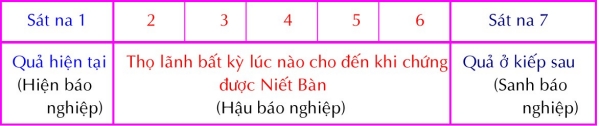 Gồm có 4 loại: Hiện Báo Nghiệp (Diṭṭhadhammavedanīyakamma):là những hành động thiện hoặc ác có quả báo ngay trong kiếp sống hiện tại. Theo Abhidhamma, chúng ta tạo nghiệp khi tâm Ðổng Tốc khởi lên, tâm này tồn tại 7 sát na trong lộ trình tâm. Nghiệp được tạo do sở hữu Tư phối hợp với các tâm thiện hay bất thiện vào tâm sát na thứ nhất, sẽ thọ quả ngay trong kiếp hiện tại. Do đó gọi là Hiện Báo Nghiệp. Thí dụ như sát nhơn phải đền mạng, hoặc như trong tích chuyện có anh hàng bò, cắt lưỡi bò nướng ăn, liền bị đứt lưỡi và chết một cách rất đau khổ ngay trong kiếp hiện tại. Sanh Báo Nghiệp (Upapajjavedanīya): là những hành động thiện, ác tạo quả nơi đời sau. Theo Abhidhamma, những nghiệp này được tạo do sở hữu Tư phối hợp với các tâm thiện hay bất thiện vào tâm sát na thứ 7 của tâm Ðổng Tốc. Thí dụ vì tạo ác nghiệp, khi chết bị đọa vào 4 đường ác đạo hoặc nhờ làm điều lành, khi chết được tái sanh trong nhàn cảnh. Hậu Báo Nghiệp (Aparāpariyavedanīya): là những hành động thiện hoặc bất thiện được trổ quả từ đời thứ hai trở về sau, cho đến khi đạt Niết-Bàn. Như trường hợp Ðại Ðức Mục Kiền Liên bị bọn cướp giết hoặc Ðức Phật phải mang bệnh kiết lỵ,... Nghiệp này được tạo do sở hữu Tư hiệp với các tâm thiện hay bất thiện vào lúc tâm sát na thứ 2 đến thứ 6 của tâm Ðổng Tốc. Vô Hiệu Nghiệp (Ahosikamma): Những hành động thiện hoặc ác không còn khả năng để cho quả được gọi là Vô Hiệu Nghiệp. Thật ra không có loại nghiệp nào gọi là Vô Hiệu nghiệp, nhưng nếu các quả báo ở đời này hay đời sau mà không thành tựu được (vì không đũ nhân duyên) thì các nghiệp báo ấy được gọi là Vô Hiệu Nghiệp. 2) Sức mạnh của nghiệp: Tùy theo hành động Thiện hay Bất thiện, quả sinh ra sẽ có những phản ứng mạnh hay yếu. Sức mạnh đó được chia làm 4 loại sau: a. Cực Trọng Nghiệp (Garukakamma): là những nghiệp gây ra bởi những hành động rất thiện hay rất ác. Nghiệp này nhất định tạo quả ngay trong đời này hay đời sau. Nếu là nghiệp thiện, thời thuộc về các ý nghiệp như Thiền Sắc giới hay Vô Sắc giới, hoặc hành Thập hạnh Phúc, tu Thập Ðộ, ... nếu là nghiệp Bất Thiện như giết cha, giết mẹ, giết A-La-Hán, làm thân Phật chảy máu, phá hòa hợp Tăng. Năm nghiệp vừa kể còn gọi là Vô Gián Nghiệp (Ānantariyakamma) và nhất định sẽ cho quả ở kiếp sau. Một người tu thiền, lở phạm cực trọng nghiệp, việc thiện của người này sẽ bị tiêu trừ ngay tức khắc. Ðời sống kế tiếp của vị này sẽ bị cực trọng nghiệp chi phối, như Devadatta mất thần thông và phải sanh vào cảnh ác thú vì đã làm Ðức Phật bị thương và phá hoại hòa hợp tăng. Hay vua A Xà Thế (Ajātasattu) không thể chứng Sơ quả vì đã giết phụ vương. b. Cận Tử Nghiệp (Āsannakamma): là những hành động Thiện hay Bất Thiện khởi theo Thân, Khẩu, Ý (làm ra hay nhớ nghĩ đến) trong giờ phút lâm chung. Nghiệp này cũng có sức mạnh gần như Cực Trọng Nghiệp vì nó chi phối đến đời sống sau này. Ngay cả Cực Trọng Nghiệp cũng phải diễn qua hình thức Cận Tử Nghiệp để chi phối đời sống kế tiếp. Vì lý do đó nên người ta hay tổ chức nhiều nghi lễ để khiến người sắp chết nhớ đến việc thiện mình đã làm hầu được tái sanh nơi cõi tốt đẹp hơn. Một người ác có thể tục sinh vào cõi Thiện thú nếu khi chết, người ấy làm hay nhớ đến một Thiện sự mà mình đã làm. Trái lại, một người thiện có thể sanh vào cõi ác thú vì khi chết, người ấy làm hay nhớ đến một việc ác. Như hoàng hậu Mallika vợ vua Kosala, bà ấy sống một đời sống ngay thẳng tốt lành, nhưng lúc lâm chung, nhớ đến một lời nói láo của mình, nên phải sống 7 ngày đau khổ trong ác thú. Hay vua A Dục, vị đại hộ pháp của giáo hội, phải tái sinh trong kiếp rắn, vì trong giờ lâm chung nổi cơn sân hận, ... c. Tập Quán Nghiệp (Ācinnakamma): Là những hành động Thiện hay Bất thiện, do thường làm nên trở thành thói quen, tập quán, cá tánh của con người. Khi sắp từ giã cuộc đời, người đó nhớ lại các việc đã quen làm đó. Như anh đồ tể Cunda, dầu hằng ngày sống bên cạnh chùa của Ðức Thế Tôn, khi chết la hét như con heo vì nhớ lại thói quen thường làm của mình. Vua Dutthagāmi ở Tích Lan hàng ngày thường để bát chư tăng, khi sắp băng hà, ngài nhớ lại việc này và cảm thấy hoan hỷ nên được tái sanh vào cung trời Ðẩu Xuất. d. Khinh Thiểu Nghiệp (Katattākamma): Còn gọi là Tích Lủy Nghiệp, là những nghiệp Thiện hay Bất Thiện không thuộc vào ba trường hợp kể trên, trong khi làm lại không trực tiếp với đối tượng bị làm và làm xong thì quên liền. Nghiệp này rất nhẹ và rất ít có cơ hội trổ quả (nhưng nếu ba nghiệp kể trên không có cơ hội kết quả thì nghiệp này sẽ trổ quả), tuy vậy chúng sẽ không bị mất đi khi tái sanh mà cứ tích tụ lại từ đời này đến đời khá