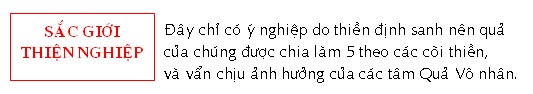 Ðây chỉ có ý nghiệp do thiền định sanh nên quả của chúng được chia làm 5 theo các cõi thiền. Và vẩn chịu ảnh hưởng của các tâm Quả Vô nhân. Ai chứng Sơ thiền một cách yếu ớt, được sanh vào cõi Phạm chúng thiên; ai chứng một cách trung bình, được sanh vào cõi Phạm phụ thiên; ai chứng một cách thù thắng, được sanh vào cõi Ðại phạm thiên. Ai chứng Nhị và Tam thiền một cách yếu ớt, được sanh vào cõi Thiểu quang thiên; ai chứng một cách trung bình, được sanh vào cõi Vô lượng quang thiên; ai chứng một cách thù thắng, được sanh vào cõi Quang âm thiên. Ai chứng Tứ thiền một cách yếu ớt, được sanh vào cõi Thiểu tịnh thiên; ai chứng một cách trung bình, được sanh vào cõi Vô lượng tịnh thiên; ai chứng một cách thù thắng, được sanh vào cõi Biến tịnh thiên. Hàng Nhập lưu khi chứng Ðệ Ngũ thiền sẻ sanh vào cõi Quảng quả thiên; hàng Dự lưu và hàng Nhất lai chứng Ðệ Ngũ thiền được sanh vào cõi Quảng quả thiên; nhưng nếu các vị này không tha thiết đến các cảnh giới có sắc (khi tu tập thiền định, các vị không chấp trước vào tưởng) thì sẽ được sanh vào Vô sắc giới thiên. Các hàng Bất lai chứng Ðệ Ngũ thiền và các tâm sở Tín, Tấn, Niệm, Ðịnh và Huệ được phát triển đồng đều, được sanh vào cõi Quảng quả thiên. Nếu Tín phát triển mạnh và lấn ác các tâm sở khác, được sanh vào cõi Vô phiền thiên. Nếu Tinh Tấn lấn ác các tâm sở khác, được sanh vào cõi Vô nhiệt thiên. Nếu Niệm lấn ác các tâm sở khác, được sanh vào cõi Thiện kiến thiên. Nếu Ðịnh lấn ác các tâm sở khác, được sanh vào cõi Thiện hiện thiên. Nếu Huệ lấn ác các tâm sở khác, được sanh vào cõi Sắc cứu cánh thiên. Các vị Bất lai, không có qui luật nhất định là các vị không được sanh vào các cõi khác (Te pana aññattha na nibbattantīti niyamonatthi). Các vị A-na-hàm chứng được thiền định trước khi chết, được sanh vào cõi Tịnh cư thiên.