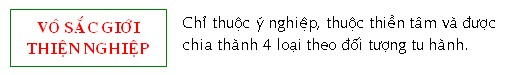 Chỉ thuộc ý nghiệp, thuộc thiền tâm và được chia thành 4 loại theo đối tượng tu hành. Ðối với Vô sắc giới thiện tâm, nếu chứng được tâm nào thì sanh vào cõi Vô sắc giới tương đương với tâm đã chứng. Các thiện tâm làm tác động ở đây bao gồm các thiện tâm của Sắc giới và Vô sắc giới. Chết là sự chấm dứt tạm thời của một hiện tượng tạm thời. Chết là sự diệt tận của Mạng quyền (Jīvitindraya), sức nóng (Usna = Tejodhātu) và Thức (Viññāṇa) của một cá nhân. Chết không phải là đoạn diệt hẳn, mà chết tại chỗ này, là sanh lại ở chỗ khác. Thọ diệt: một người chết vì năng lực của đời sống đã tận. Sở hữu Tư (Cetanā) lúc này rất mạnh, nó chi phối sự tái sanh. Nghiệp diệt: một người có thể chết trước tuổi thọ của mình do bởi quả mà người đó thọ lảnh ở kiếp này đã hết (năng lực của sanh nghiệp đã tận). Thọ và nghiệp đồng diệt: chết vì cả hai năng lực bị diệt tận. Sát nghiệp (Upacchedakakamma): là nghiệp cắt đứt thình lình sức sống của sanh nghiệp. Sức mạnh của một nghiệp quá khứ có thể bất thần hiện khởi làm tiêu tan sanh nghiệp của một loài hữu tình khiến họ phải chết. Ba cái chết kể trên gọi là chết bình thường hay chết đúng thời (Kālamarana). Cái chết do Sát nghiệp gây ra gọi là chết phi thời hay là chết bất đắc kỳ tử (Akālamarana). Một người khi sắp chết, một thiện hay bất thiện nghiệp khởi ra trước người đó, nghiệp ấy có thể là: Cực trọng nghiệp: có thể là nghiệp thiện như thiền, hay một nghiệp ác như giết cha ... nghiệp này quá mạnh, hiện lên và lấn ác các nghiệp khác. Nếu Cực trọng nghiệp không có thì Cận tử nghiệp sẽ khởi lên, một niệm thiện hay bất thiện sẽ khởi lên do bởi kinh nghiệm mà người ấy đã làm khi xưa. Hay một nghiệp tướng (Āsana kamma) tức là sắc, thanh, hương, vị, xúc, pháp mà người ấy nhận lảnh khi làm nghiệp ấy sẽ khởi lên. Hoặc Thú tướng (Gatinimitta) tức là một hình tướng của cảnh giới sắp tái sanh sẽ khởi lên làm cận tử nghiệp. Nghiệp được nhận thức bởi ý môn, thuộc về một đối tượng quá khứ. Nghiệp tướng hiện khởi qua một trong sáu căn môn, thuộc về một đối tượng quá khứ hay hiện tại. Thú tướng là một sắc tướng chỉ xuất hiện trong giờ phút lâm chung, hay hiện khởi ra dưới hình thức chiêm bao ở một người khỏe mạnh và ngũ thật ngon. Ðược nhận thức bởi một trong sáu căn môn, thuộc về một đối tượng quá khứ hay hiện tại. Những điều kể trên khởi lên trong 5 tâm sát na của tâm Ðổng tốc, rồi được tâm Thập di ghi nhận trong 2 tâm sát na. Liền theo đó, y cứ theo đối tượng khởi lên, người đó sẽ tái sanh trong cảnh tương ứng. Khi từ trần, một hữu tình với 3 nhân có thể tái sanh ở mọi cảnh giới. Những hữu tình khác (vô nhân, hoặc hai nhân) chỉ tái sanh ở cõi Dục giới. Khi từ trần ở cõi Sắc giới, sẽ không bị tái sanh thành một hữu tình vô nhân; đối tượng Nghiệp tướng ở đây thuộc về khái niệm (đối tượng thiền quán). Khi từ trần ở cõi Vô sắc giới, sẽ được tái sanh ở cõi Vô sắc, hoặc tái sanh ở cõi Dục giới với ba nhân, tùy theo trường hợp; hoặc tái sanh ở một cõi cao hơn nhưng không tái sanh ở một cõi thấp hơn; đối tượng Nghiệp tướng ở đây thuộc về Ðáo đại và khái niệm (như hư không vô biên). Khi tái sanh, liền sau khi tâm Tục sinh diệt, tâm Hộ kiếp sẽ khởi lên; và như một dòng sông, dòng Hộ kiếp sẽ trôi chảy cho đến lúc người đó mạng chung, khi ấy Hộ kiếp sẽ trở thành tâm Tử rồi diệt. Tiếp theo đó, tâm Tục sinh lại được sanh ra ..... Trong đời sống, sự luân chuyển của tâm Hộ kiếp, bị chận đứng nhiều lần bởi các lộâ trình tâm thức khởi lên; nhưng một khi lộ trình tâm chìm xuống (Hộ kiếp), thì tâm Hộ kiếp lại khởi lên và tiếp tục lưu chuyển cho đến khi bị gián đoạn vì một lộ trình tâm khác. Tâm Tục Sinh, tâm Hộ Kiếp và tâm Tử của một đời sống cùng y cứ trên một đối tượng giống nhau, cùng có các sở hữu tâm như nhau. Các tâm này thực ra chỉ là một tâm nhưng mang 3 tên khác nhau tùy theo công tác chúng đang làm. -ooOoo-