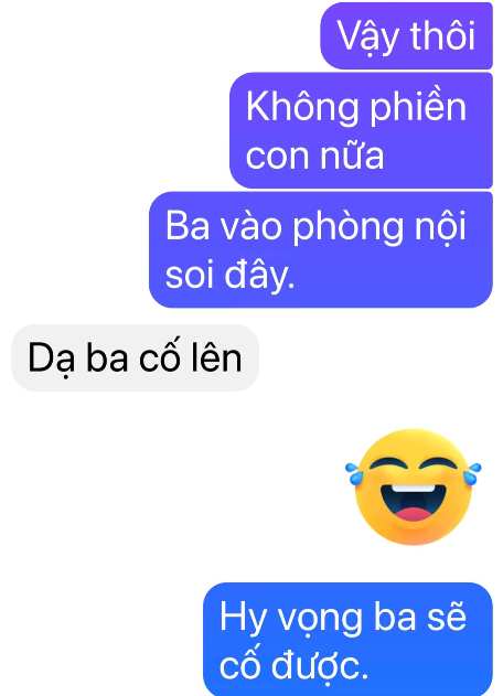 soi đây, nó nhắn dạ ba cố lên, anh thả mặt cười ra nước mắt, và câu hy